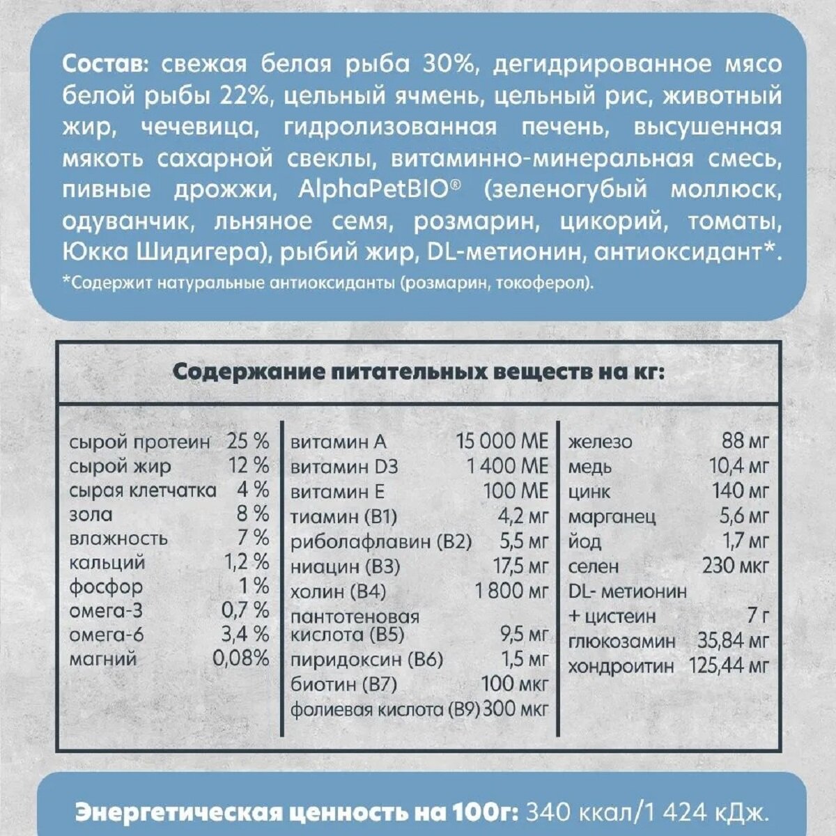 | Витамины | Витамин А - 10 000 МЕ/кг Витамин D - 1200 МЕ/кг Витамин Е - 80 МЕ/кг Витамин В1 - 4 мг/кг Витамин В2 - 5 мг/кг Витамин B6 - 2,74 мг/кг Ниацин - 44 мг/кг Пантотеновая кислота - 14,2 мг/кг Холин - 2800 мг/кг Биотин - 180 мкг/кг Фолиевая кислота - 824 мкг/кг Хондроитин - 125 440 мкг/кг Глюкозамин - 35 840 мкг/кг DL-метионин + цистеин - 0,65% |