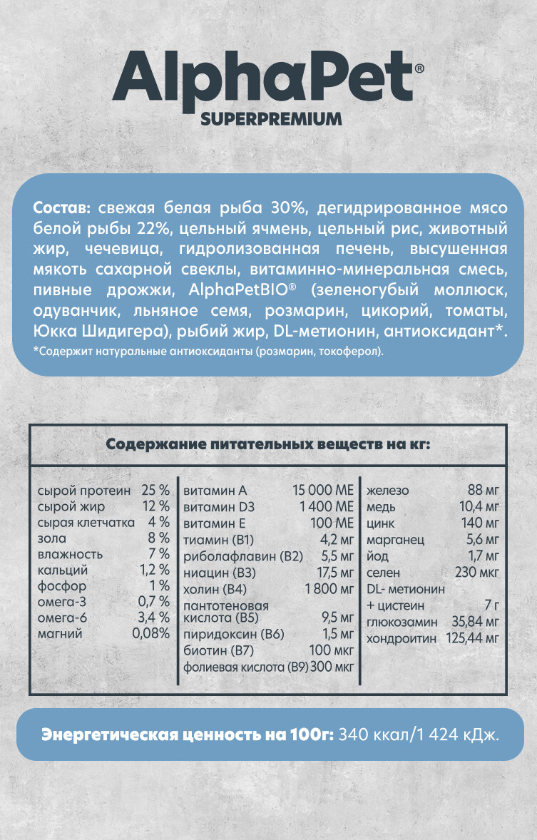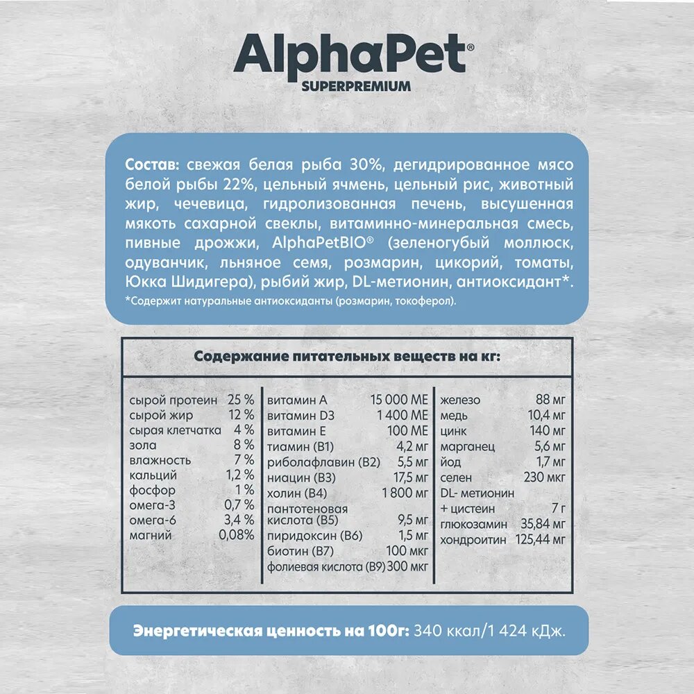 121357 AlphaPet Superpremium MONOPROTEIN Сухой корм для взрослых собак средних и крупных пород из белой рыбы 12 кг