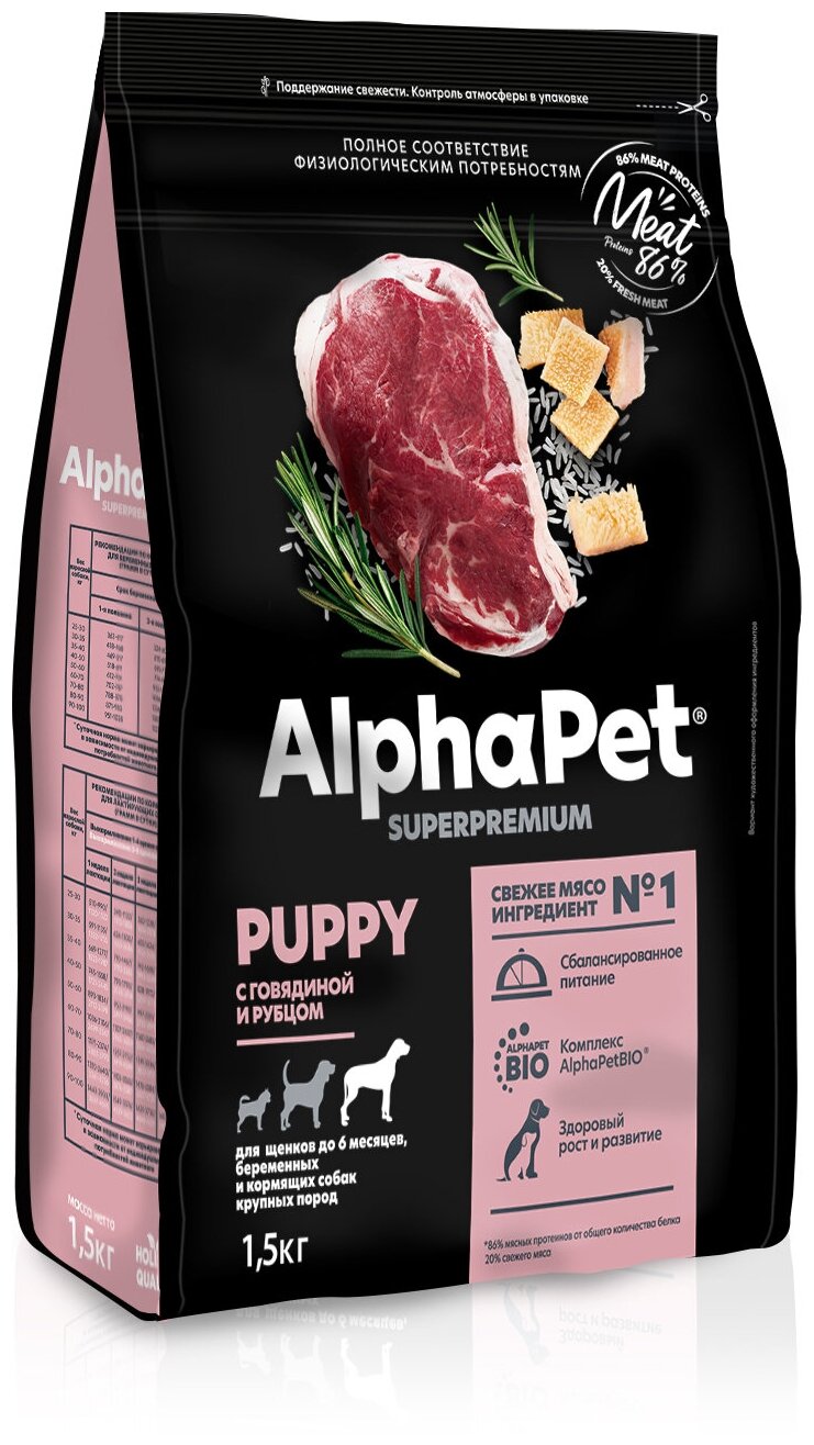 Купить Корм AlphaPet Superpremium сухой для щенков до 6 мес, беременных и кормящих собак крупных пород, говядина и рубец 1,5 кг