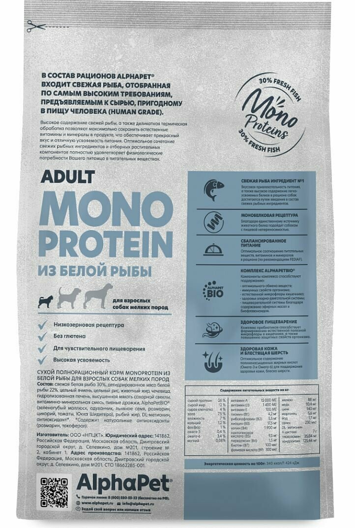 Корм сухой Alpha Pet АльфаПет MONOPROTEIN, Белая рыба для взрослых собак мелких пород, 1,5 кг