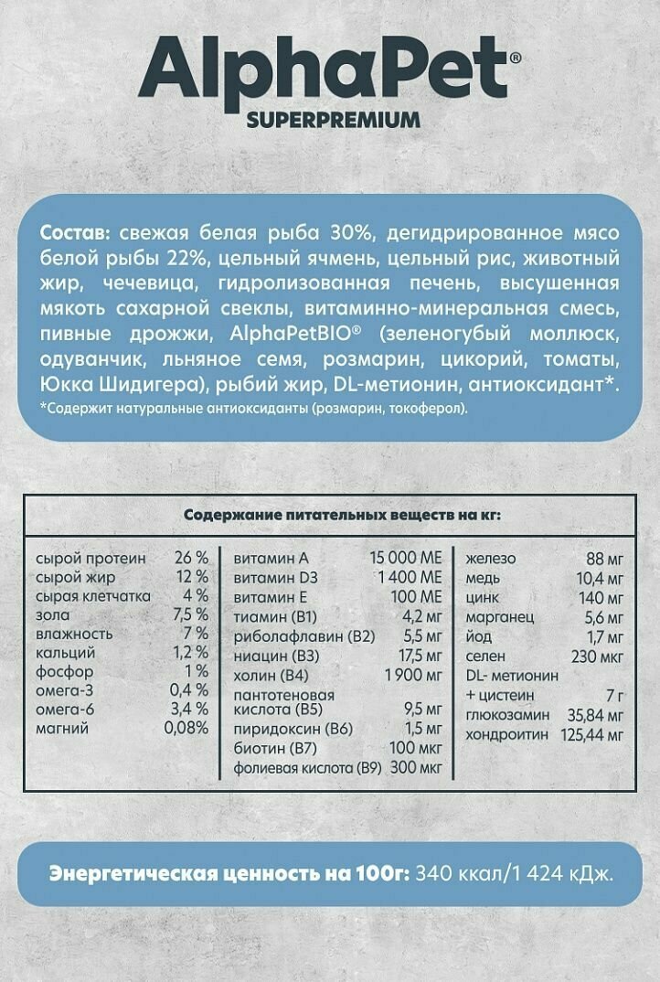 121357 AlphaPet Superpremium MONOPROTEIN Сухой корм для взрослых собак средних и крупных пород из белой рыбы 12 кг