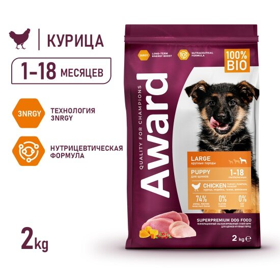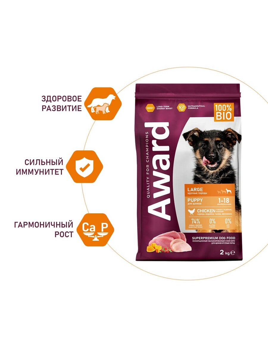 Купить Корм сухой Award для щенков от 1 месяца крупных пород с курицей и индейкой с добавлением тыквы и шиповника 2кг