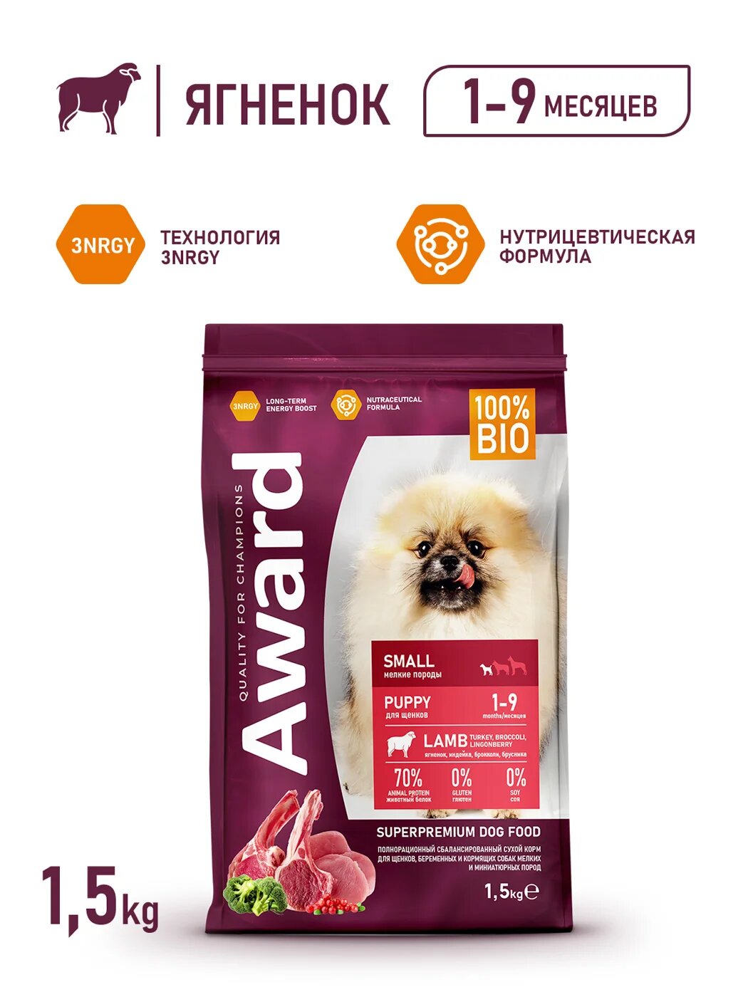 Сухой корм AWARD для щенков от 1 мес, беременных и кормящих сук мелких и мин. пород с ягненком и индейкой с добавлением брокколи и брусники 1,5кг (7173402)