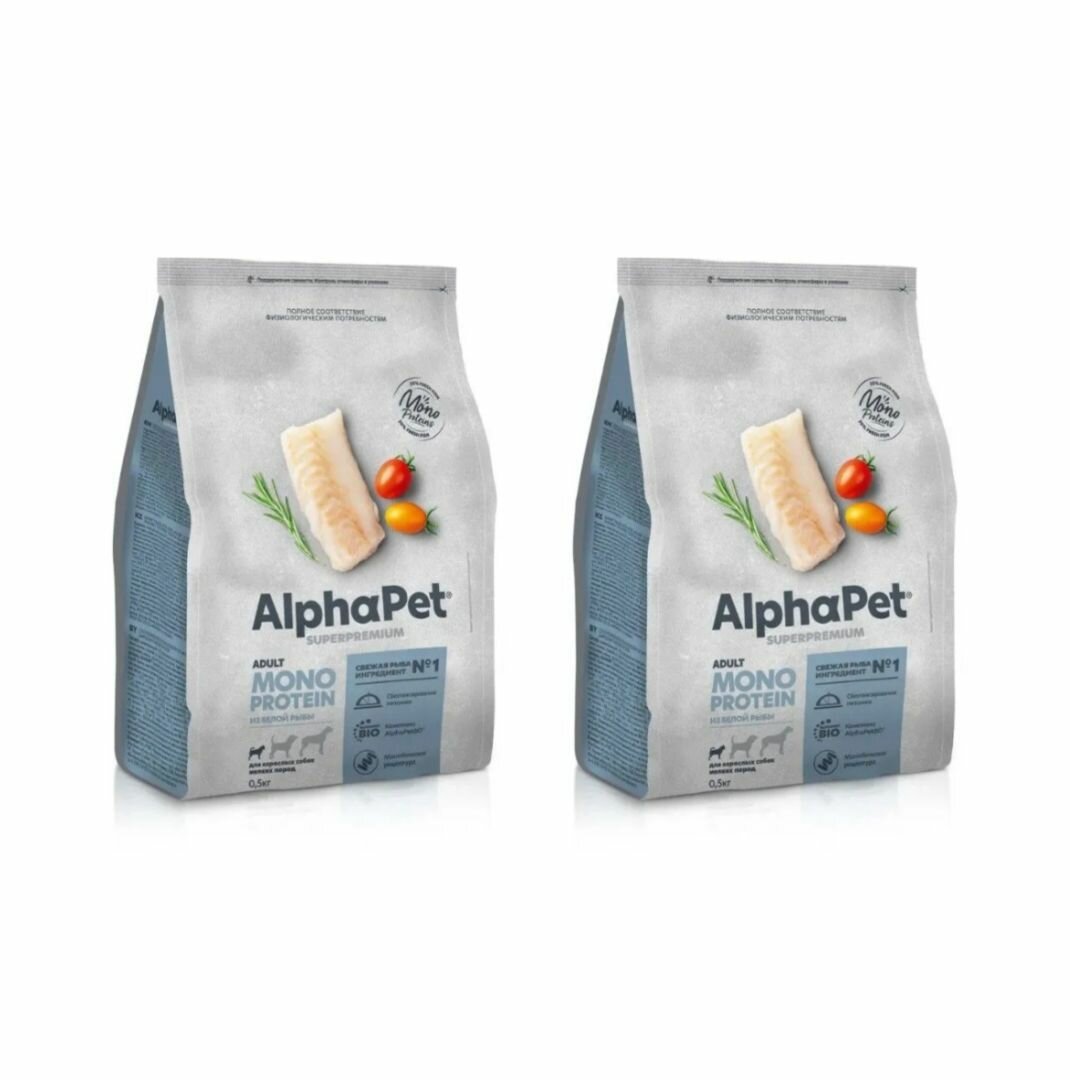 AlphaPet Корм сухой для взрослых собак мелких пород из белой рыбы, Monoprotein, Superpremium, 500 г, 2 штуки