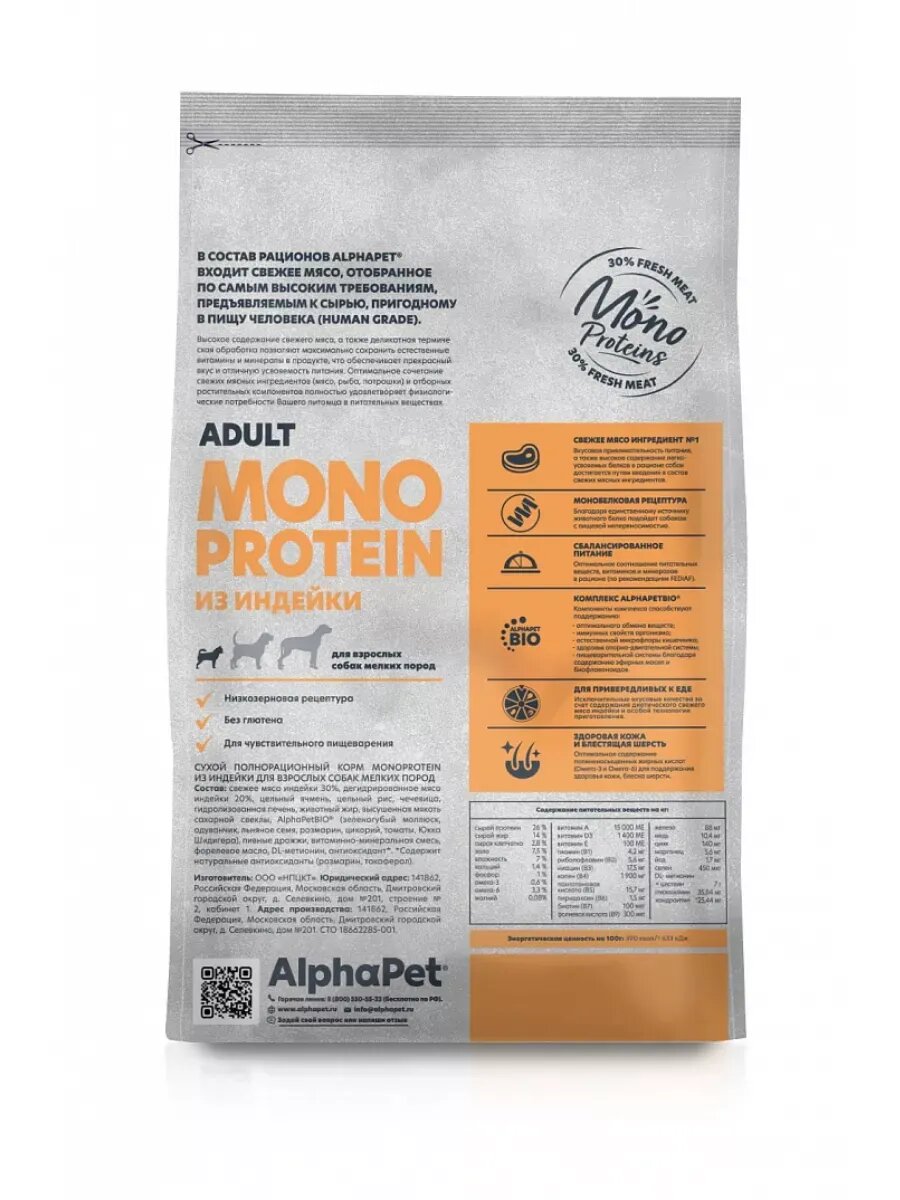 Сухой полнорационный корм MONOPROTEIN из индейки для взрослых собак мелких пород AlphaPet Superpremium 1,5 кг