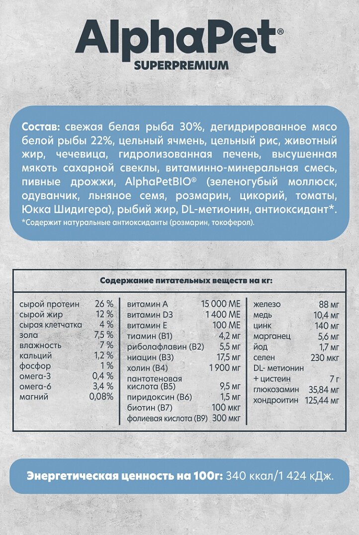 Сухой корм для собак средних и крупных пород, AlphaPet Superpremium Monoprotein, белая рыба, 12 кг