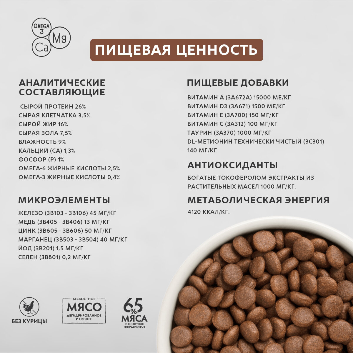 | Пищевая ценность | Сырой протеин 27%; Сырая клетчатка 3,5%; Сырой жир 13%; Сырая зола 7,5%; Влажность 9%; Кальций 1,6%; Фосфор 1,1%; Омега 6 жирные кислоты 2,5%; Омега 3 жирные кислоты 0,6% |