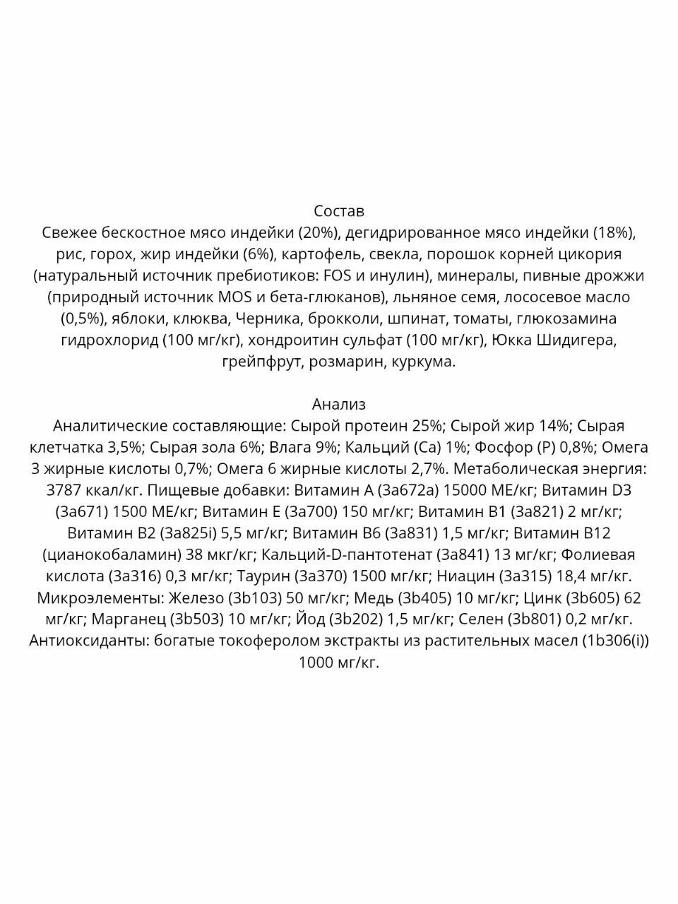 | Пищевая ценность | сырой протеин 30,0%, сырой жир 20,0%, сырая клетчатка 2,6%, сырая зола 7,5%, влага 9,0%, кальций (Cа) 1,3%, фосфор (P) 1,0%, омега 3 жирные кислоты 1,0%, омега 6 жирные кислоты 3,0% |