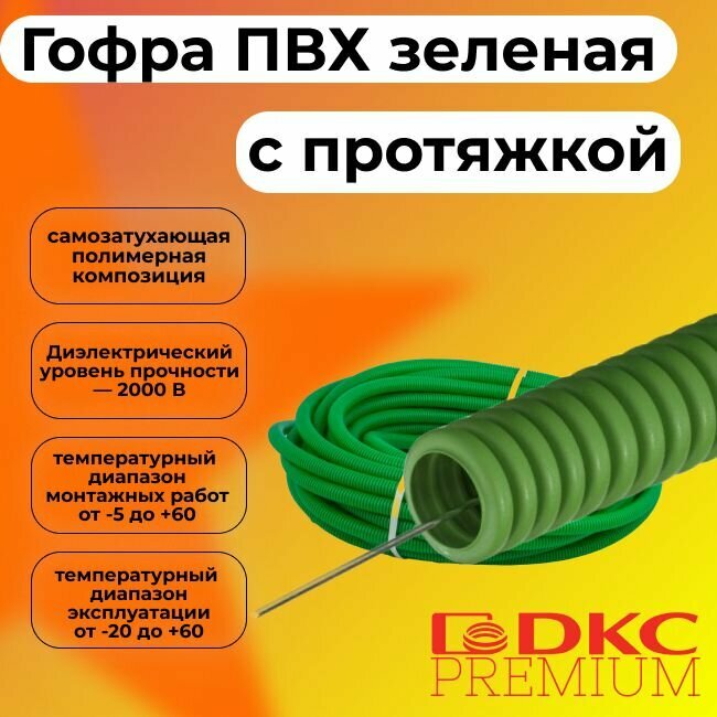 Купить Гофра для кабеля ПВХ D 20 мм с протяжкой зеленая 20 м. DKC Premium.