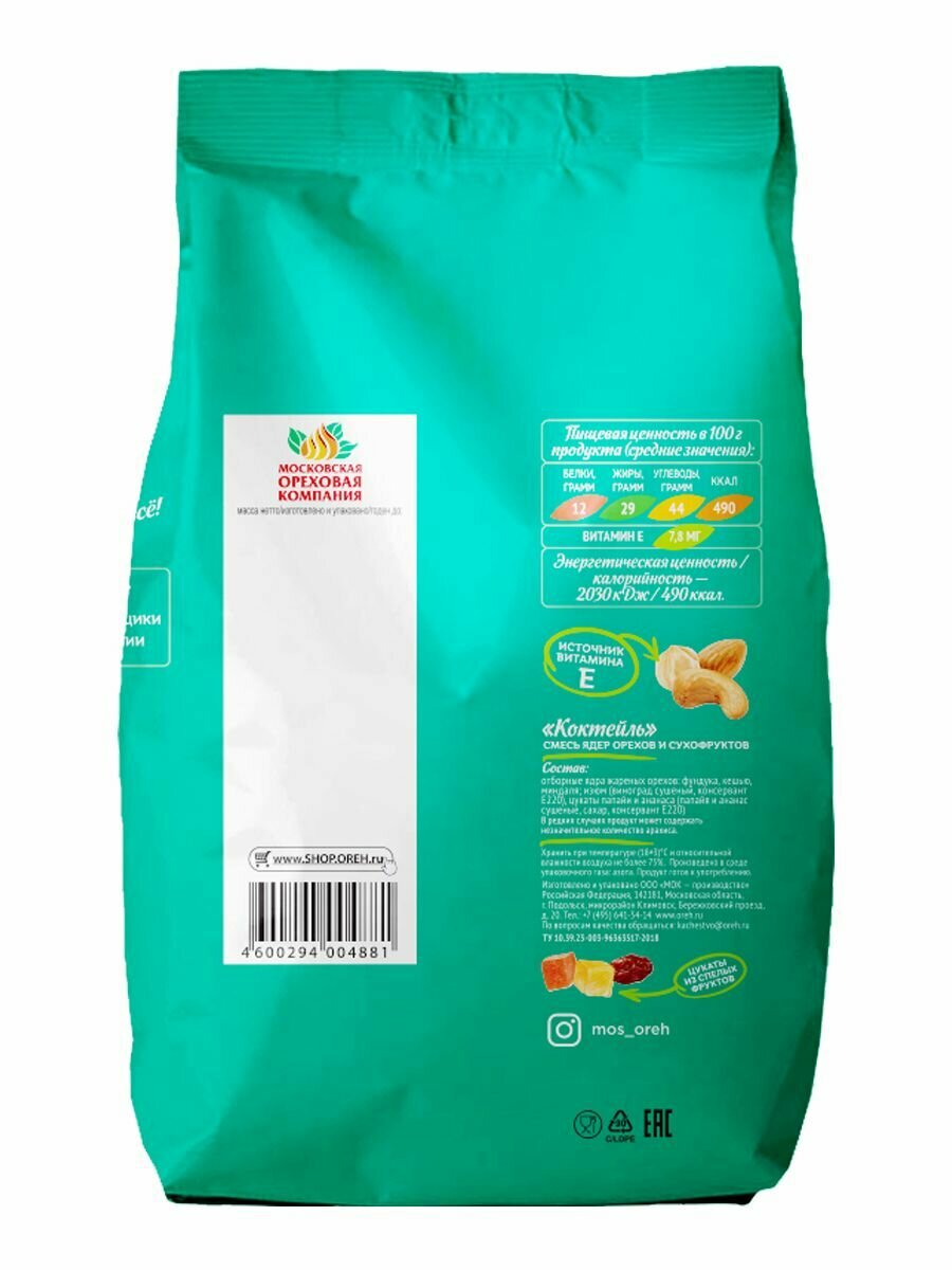 | Состав | отборные ядра жареных орехов фундука, кешью, миндаля, цукаты папайи и ананаса, изюм |