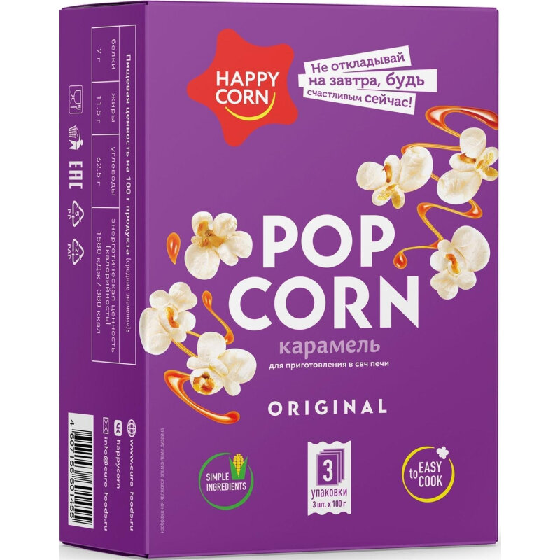 Попкорн для СВЧ "HAPPY CORN" со вкусом карамели 3 шт по 100 г