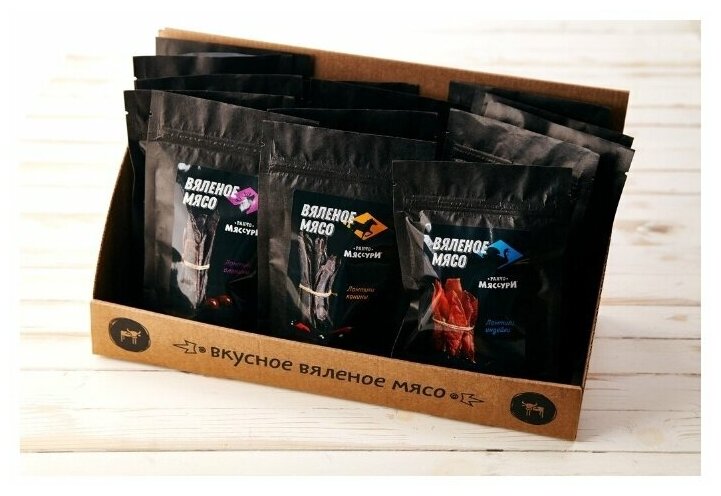 | Дополнительная информация | без усилителей вкуса; используются самые мягкие части, без жил; мясо маринуется в соли и специях, сушится более 48 часов, нарезается на ломтики толщиной около 2 мм и сразу упаковывается в пакет с высокобарьерным кислородным слоем; хранить при температуре не выше +20°С и относительной влажности воздуха не более 75%; срок хранения 180 суток; допускается появление белого соляного налета на поверхности продукта; после вскрытия хранить в холодильнике не более трех суток |
