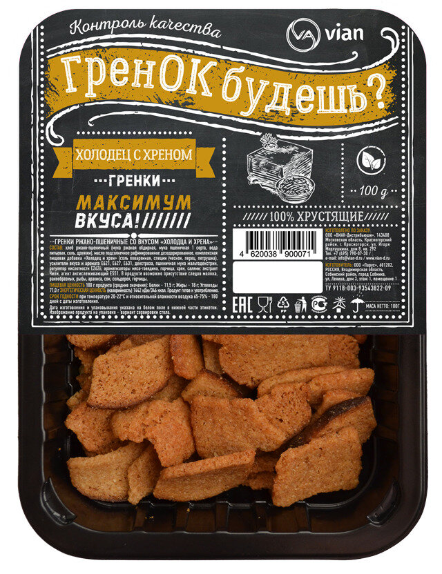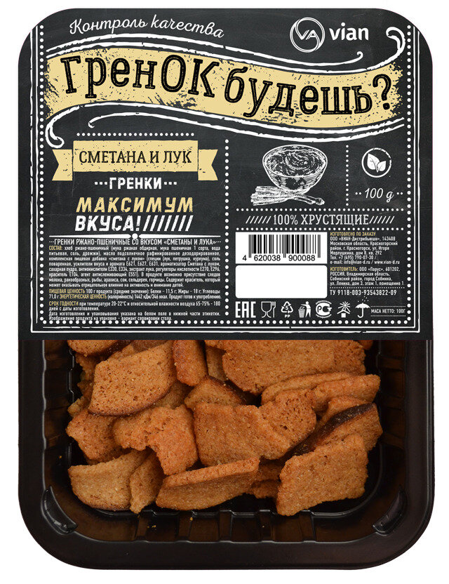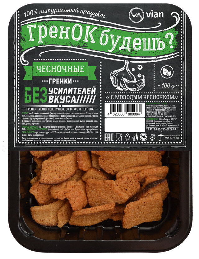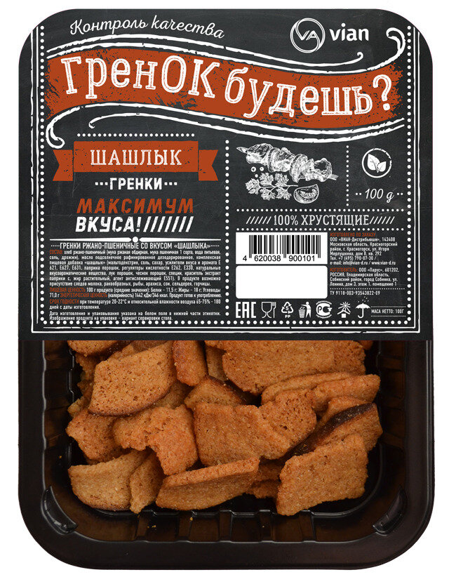| Состав | Чеснок: хлеб ржано-пшеничный, масло подсолнечное рафинированное дезодорированное, чеснок натуральный сушеный (гранулированный, резаный), соль мелкая Экстра. Холодец с хреном: хлеб ржано-пшеничный, масло подсолнечное рафинированное дезодорированное, комплексная пищевая добавка «холодец с хреном», молотые овощи, натуральные пряности. Сметана и лук: хлеб ржано-пшеничный, масло подсолнечное рафинированное дезодорированное, комплексная пищевая добавка «сметана и лук». Аджика: хлеб ржано-пшеничный, масло подсолнечное рафинированное дезодорированное, лук молотый сушеный, сушеные молотые петрушка, укроп, чеснок, паприка, соль, сахар. Шашлык: хлеб ржано-пшеничный, масло подсолнечное рафинированное дезодорированное, комплексная пищевая добавка «Шашлык». |