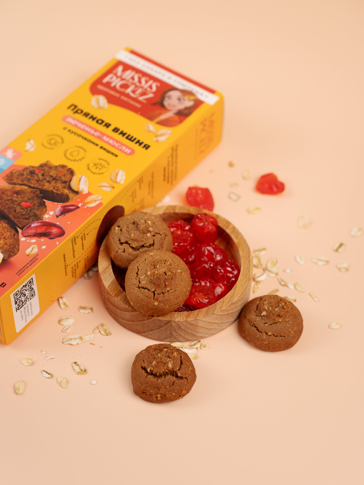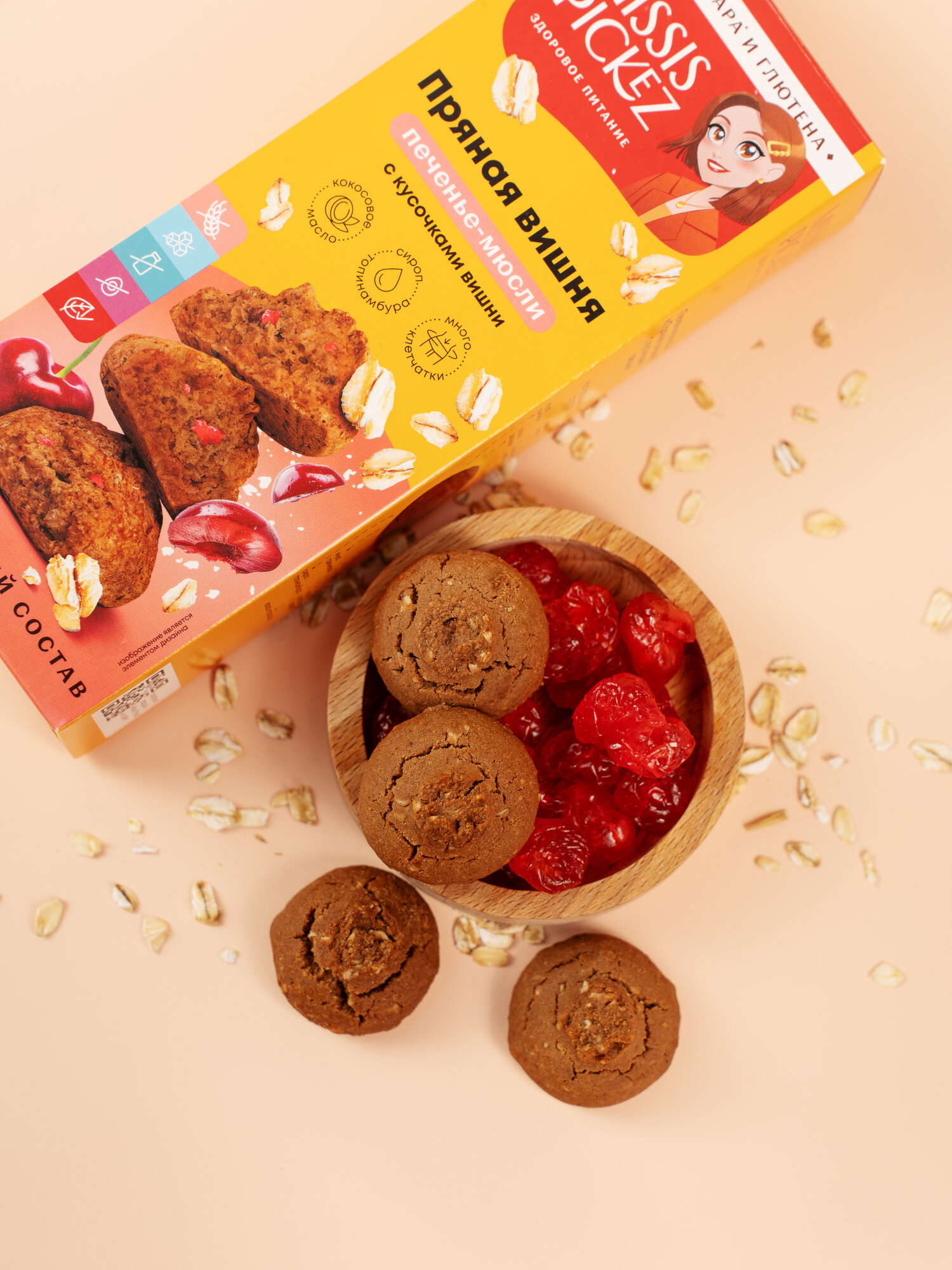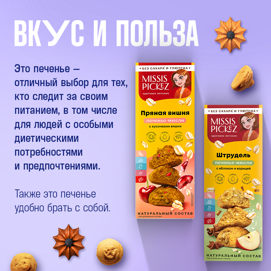 СохранитьMissis Pickez Печенье Пряная вишня, Штрудель, Апельсиновое, Банановое Без лактозы глютена и сахара Набор - 4 пачки интересное:
