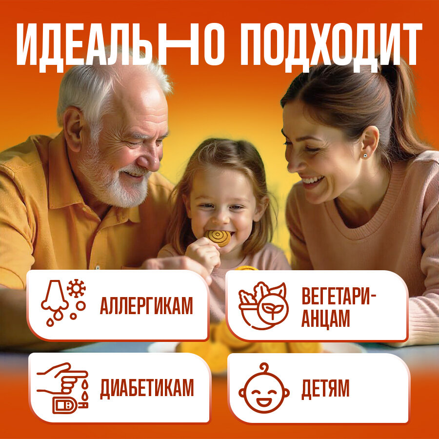 | Не содержит | ГМО / глютен / консерванты / красители / лактозу / пальмовое масло / сахар / яйца |