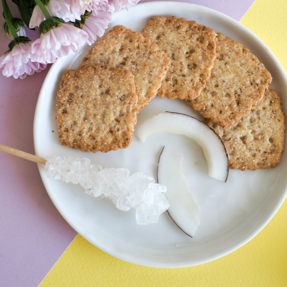 | Состав | мука пшеничная общего назначения типа М55-23, сахар, вода питьевая, масло растительное (рафинированное дезодорированное кокосовое), жир кондитерский (рафинированное дезодорированное пальмовое масло, антиокислитель (E306)), кокосовая стружка (обжаренная кокосовая стружка, сахар), кунжут обжаренный, молоко сухое обезжиренное, молоко сухое цельное, крахмал пшеничный, разрыхлители (гидрокарбонат аммония, гидрокарбонат натрия), соль, глюкоза, стабилизатор (карбонат кальция), соль для посыпки, ароматизаторы, загуститель, антиокислитель |