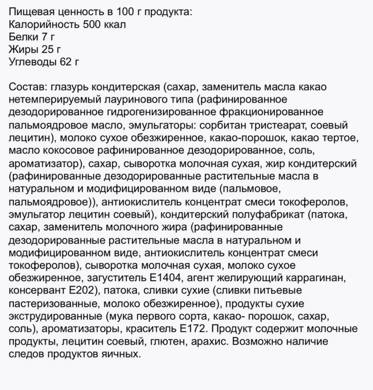 | Состав | патока, сахар, агенты желирующие: каррагинан, пектин; загуститель Е1422, регуляторы кислотности: Е331(i), Е330, Е270; краситель (вода, краситель Е160с, эмульгатор Е433), глазирователь (масло растительное подсолнечное, глазирователь (Е901), антиокислители (Е320, Е321, Е310), регулятор кислотности (Е330), эмульгатор Е471), ароматизаторы. Возможно наличие следов молочных продуктов, продуктов яичных, лецитина соевого, глютена и продукты их переработки |