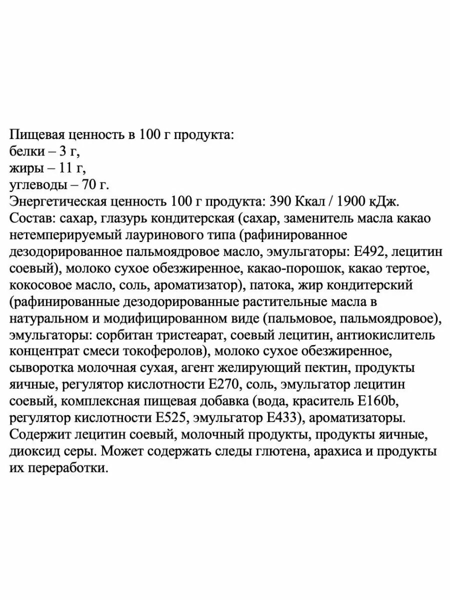 | Состав | патока, сахар, агенты желирующие: каррагинан, пектин; загуститель Е1422, регуляторы кислотности: Е331(i), Е330, Е270; краситель (вода, краситель Е160с, эмульгатор Е433), глазирователь (масло растительное подсолнечное, глазирователь (Е901), антиокислители (Е320, Е321, Е310), регулятор кислотности (Е330), эмульгатор Е471), ароматизаторы. Возможно наличие следов молочных продуктов, продуктов яичных, лецитина соевого, глютена и продукты их переработки |