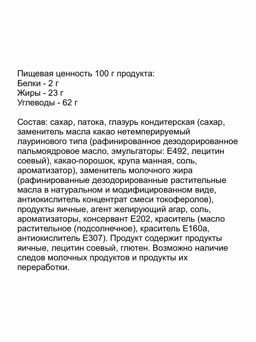 | Состав | патока, сахар, агенты желирующие: каррагинан, пектин; загуститель Е1422, регуляторы кислотности: Е331(i), Е330, Е270; краситель (вода, краситель Е160с, эмульгатор Е433), глазирователь (масло растительное подсолнечное, глазирователь (Е901), антиокислители (Е320, Е321, Е310), регулятор кислотности (Е330), эмульгатор Е471), ароматизаторы. Возможно наличие следов молочных продуктов, продуктов яичных, лецитина соевого, глютена и продукты их переработки |