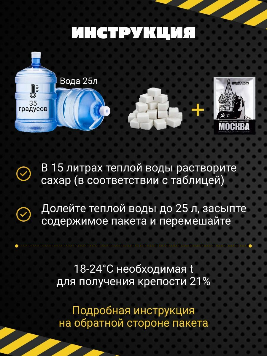 | Дополнительная информация | инструкция: налейте в ферментер 15 л теплой воды (35°с): добавьте в воду необходимое количество сахара (см. ниже) и тщательно перемешайте до полного растворения; доведите объем воды до 25 л. следите, чтобы температура раствора была в обозначенных пределах (см. ниже); всыпьте содержимое пакетика и перемешайте.; чтобы получить брагу крепостью 21% необходимо постоянно поддерживать температуру браги в пределах 18—24°с, добиться этого без специального охлаждающего оборудования не получится; содержание алкоголя в браге в зависимости от количества сахара: 6 кг сахара — до 14% алкоголя при температуре 20–35°с за 2 дня; 7 кг сахара — до 17% алкоголя при температуре 20–30°с за 3 дня; 8 кг сахара — до 19% алкоголя при температуре 20–27°с за 5 дней; 9 кг сахара — до 21% алкоголя при температуре 18–24°с за 7–10 дней |