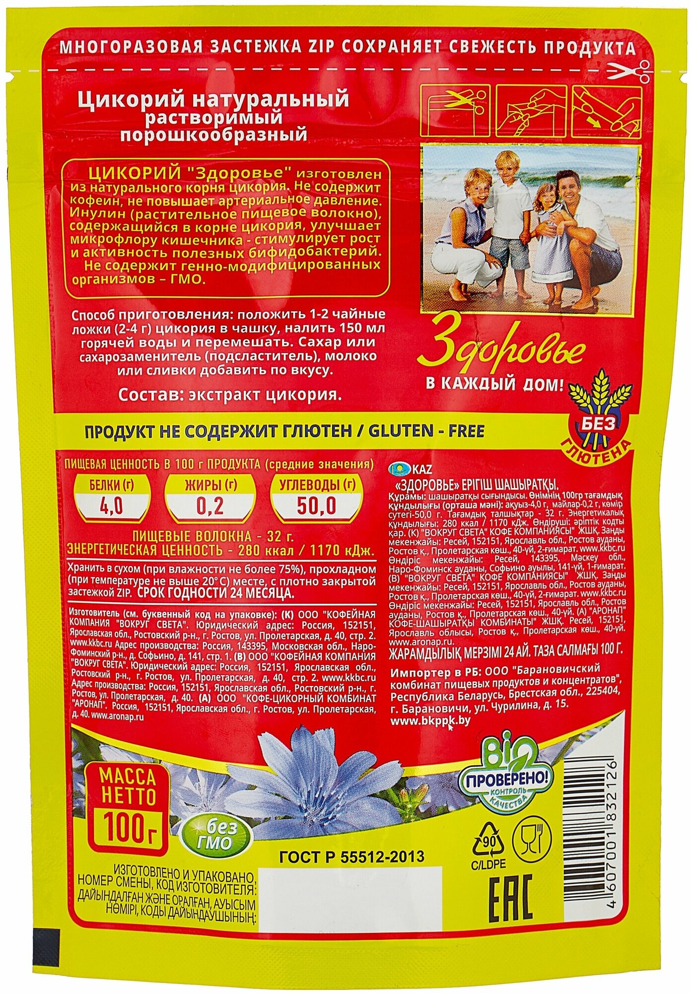 Цикорий Здоровье натуральный порошкообразный растворимый , 100г, zip пакет (комплект 4 шт.) 1832126