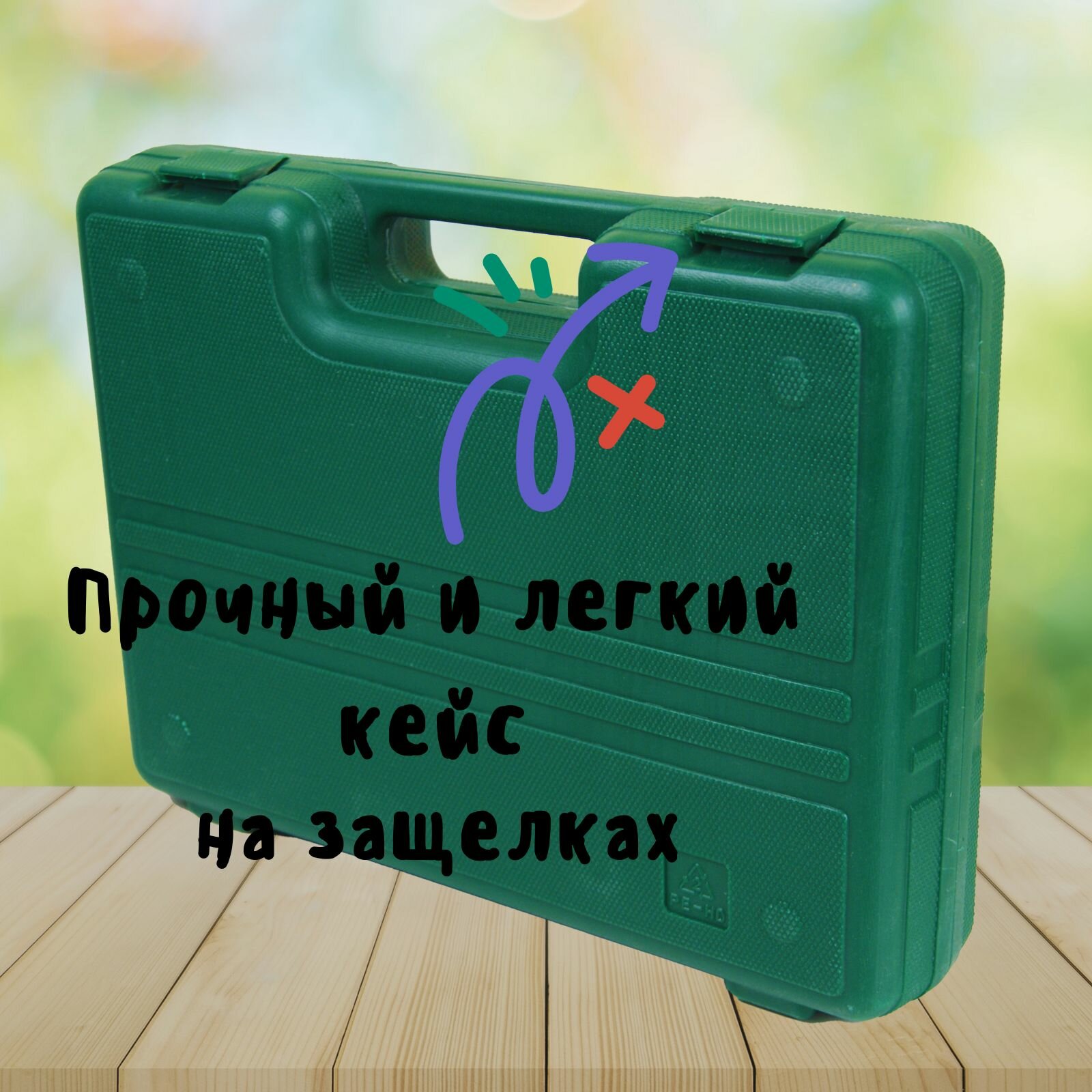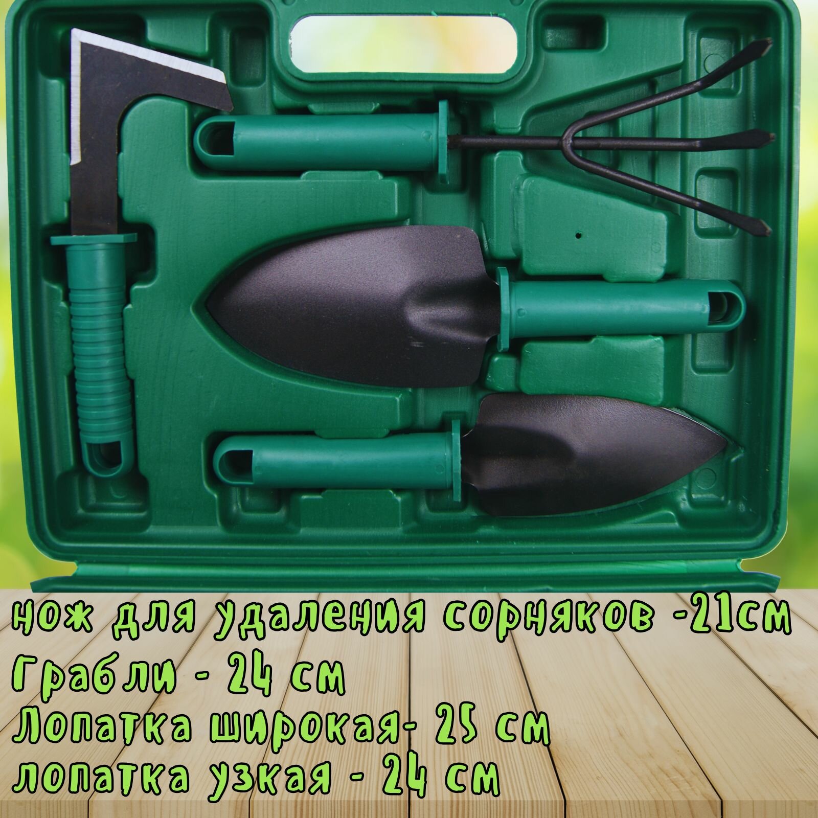 | Дополнительная информация | в комплекте: боковой нож, веерные грабли, совок широкий, совок узкий, мини-совок широкий, мини-шпатель, мини-грабли, секатор, пила складная, бутылка для полива с распылителем, кейс; размер кейса: 350х265х80 мм |