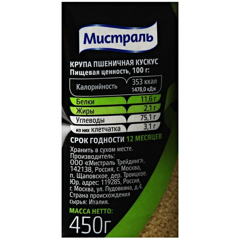 Крупа Мистраль пшеничная из твердых сортов пшеницы Кускус 450 г интересное: