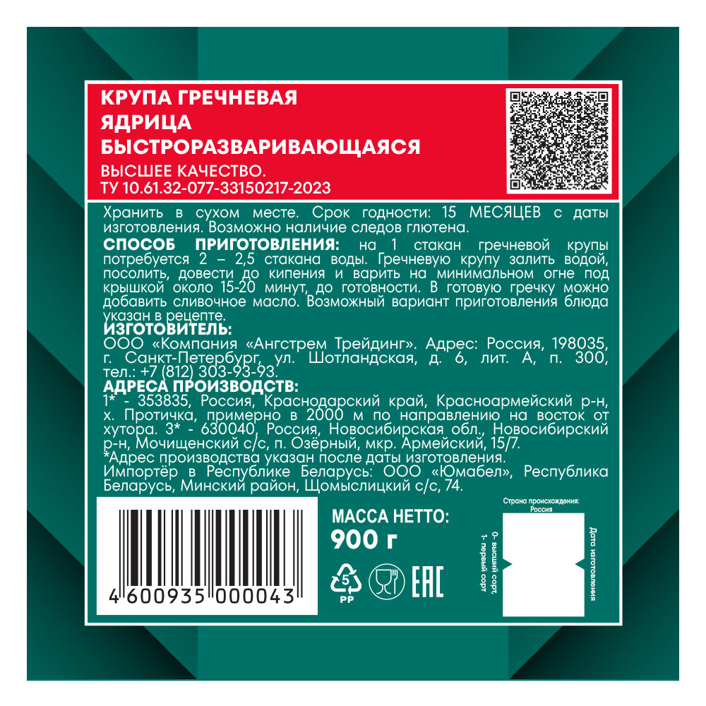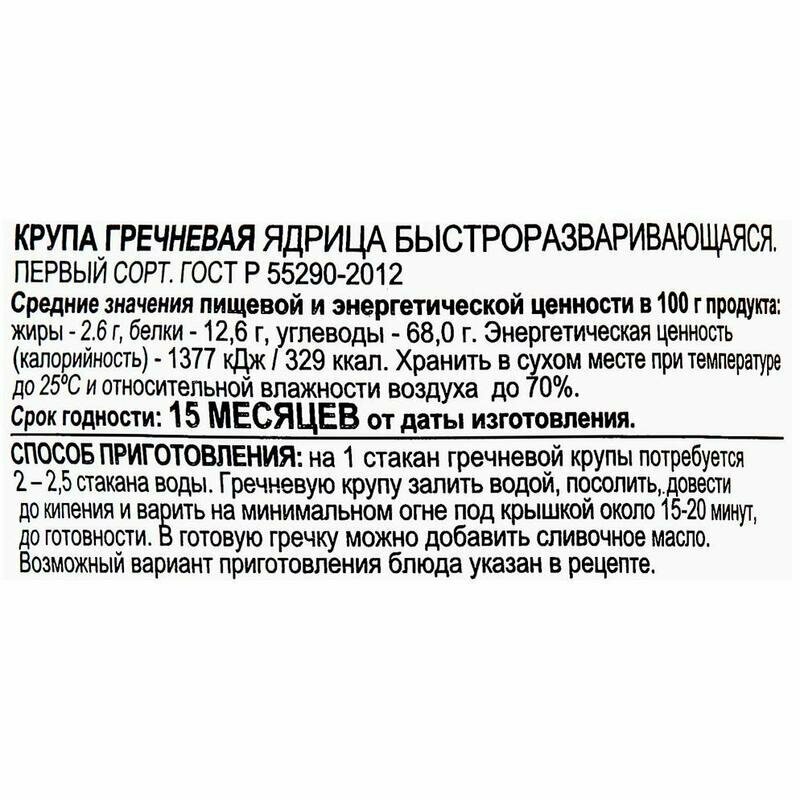| Состав | Крупа гречневая ядрица быстроразваривающаяся. Сорт первый. Возможно наличие следов глютена |