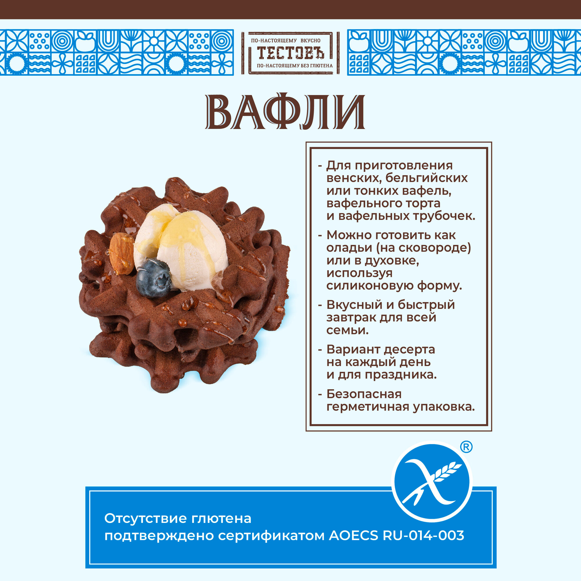 | Дополнительная информация | Новая линейка из 4-х вкусов безглютеновых вафель «Тестовъ» - это альтернатива привычным завтракам. Сладкие вафли станут отличным вариантом завтрака в кругу семьи, а несладкие гречишные можно использовать в качестве основы для бутерброда- удобно взять с собой на работу или дать ребенку в школу. |
