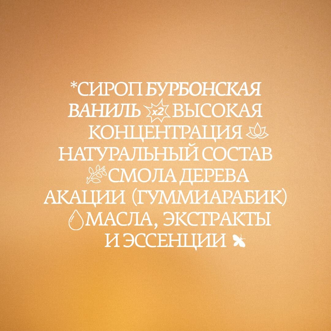 | Дополнительная информация | на основе натуральных ингредиентов; для приготовления сиропов используем соки и мякоть фруктов, пюре ягод, ореховые пасты, натуральные экстракты и специи |