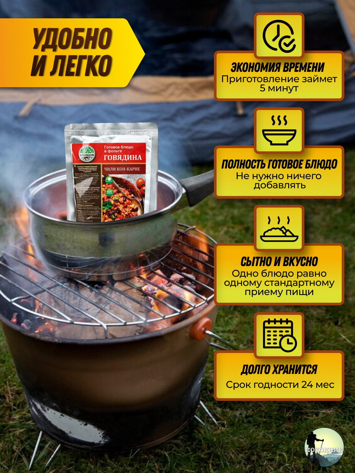 Готовое натуральное острое блюдо говядина "Чили Кон Карне" с фасолью. Сухой паек для охоты, рыбалки, в поход. 300 гр.