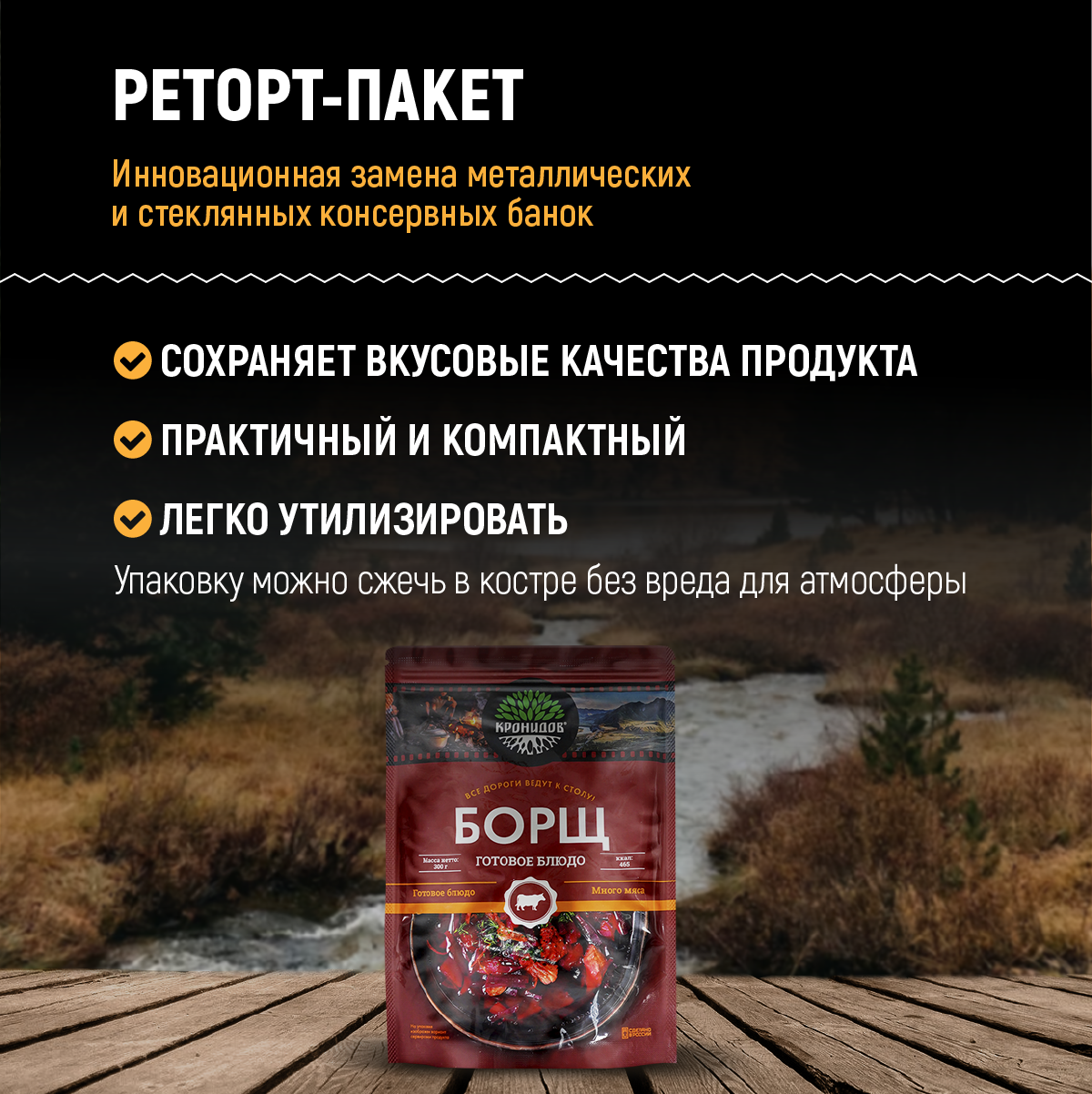 Готовое натуральное блюдо в реторт-пакете "Борщ" Кронидов Сухой паек для охоты, рыбалки, в поход Набор 6 шт. по 300 гр.