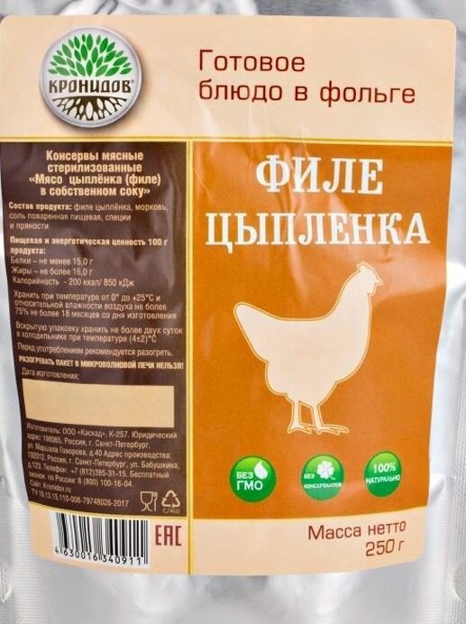 Кронидов Филе цыпленка Готовое блюдо в фольге. Консерва натуральная Набор 15 шт. по 250 г