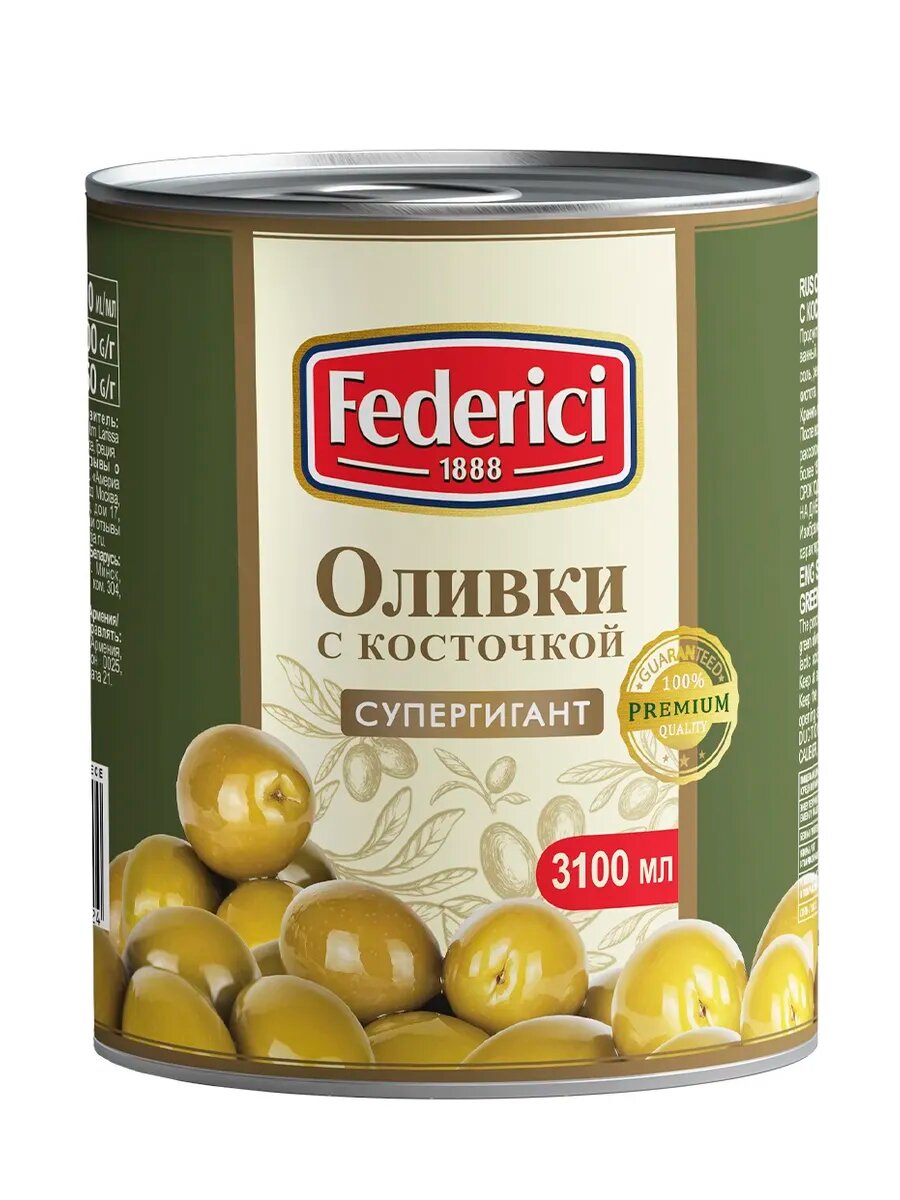 Купить Оливки Federici Супергигант, с косточкой, жестяная банка, 3кг