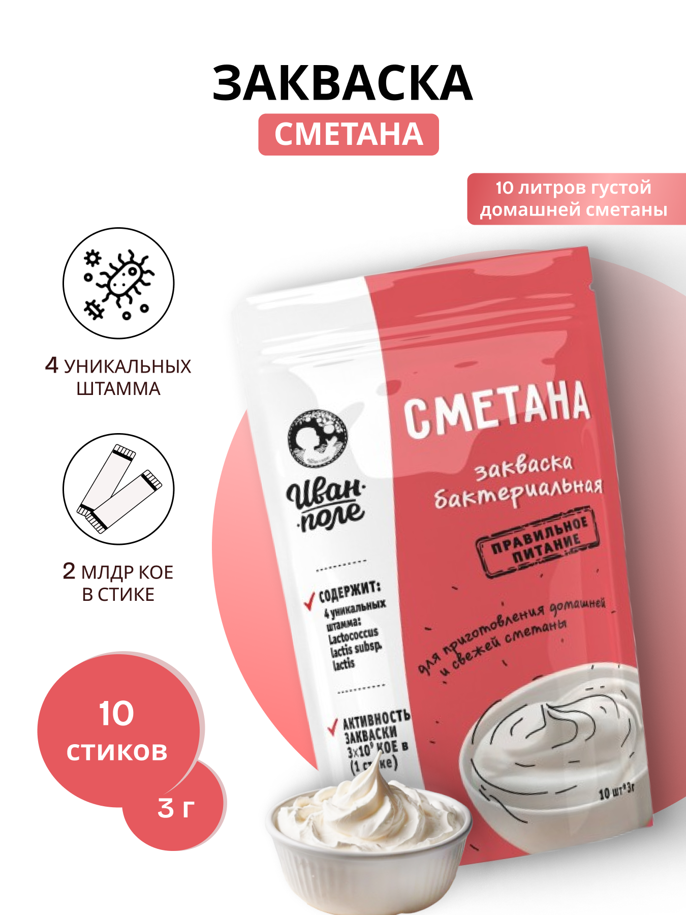 Закваска для Сметаны, 10 порций по 3 г, сухая бактериальная, Иван-поле