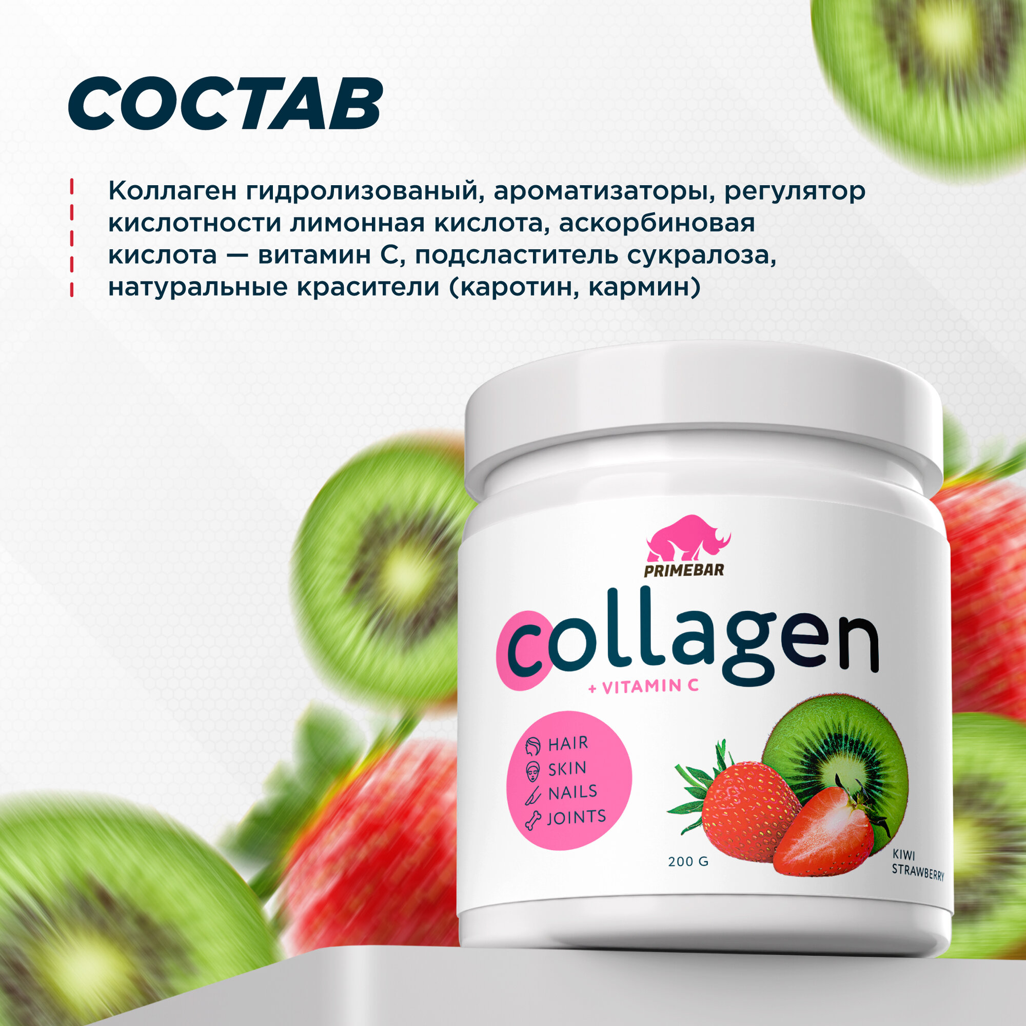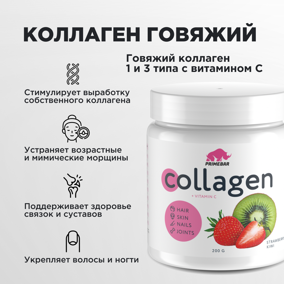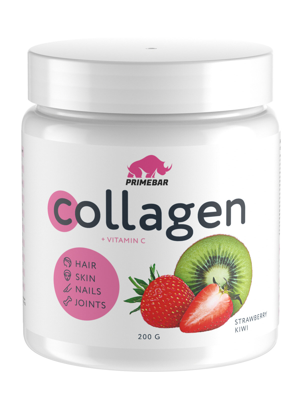 Купить Коллаген порошок говяжий 1 и 3 типа с витамином С PRIMEBAR (Collagen) со вкусом "Клубника-киви" (Strawberry-kiwi) 200 г
