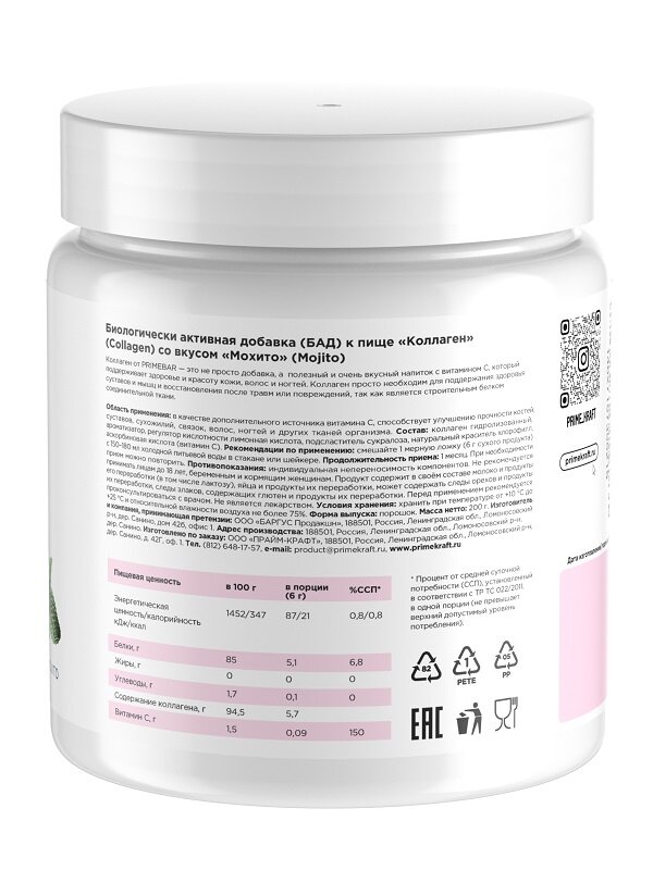 Купить Prime Kraft Collagen 200g (Мохито), Коллаген, 200 грамм, Для суставов и связок, Укрепление костей