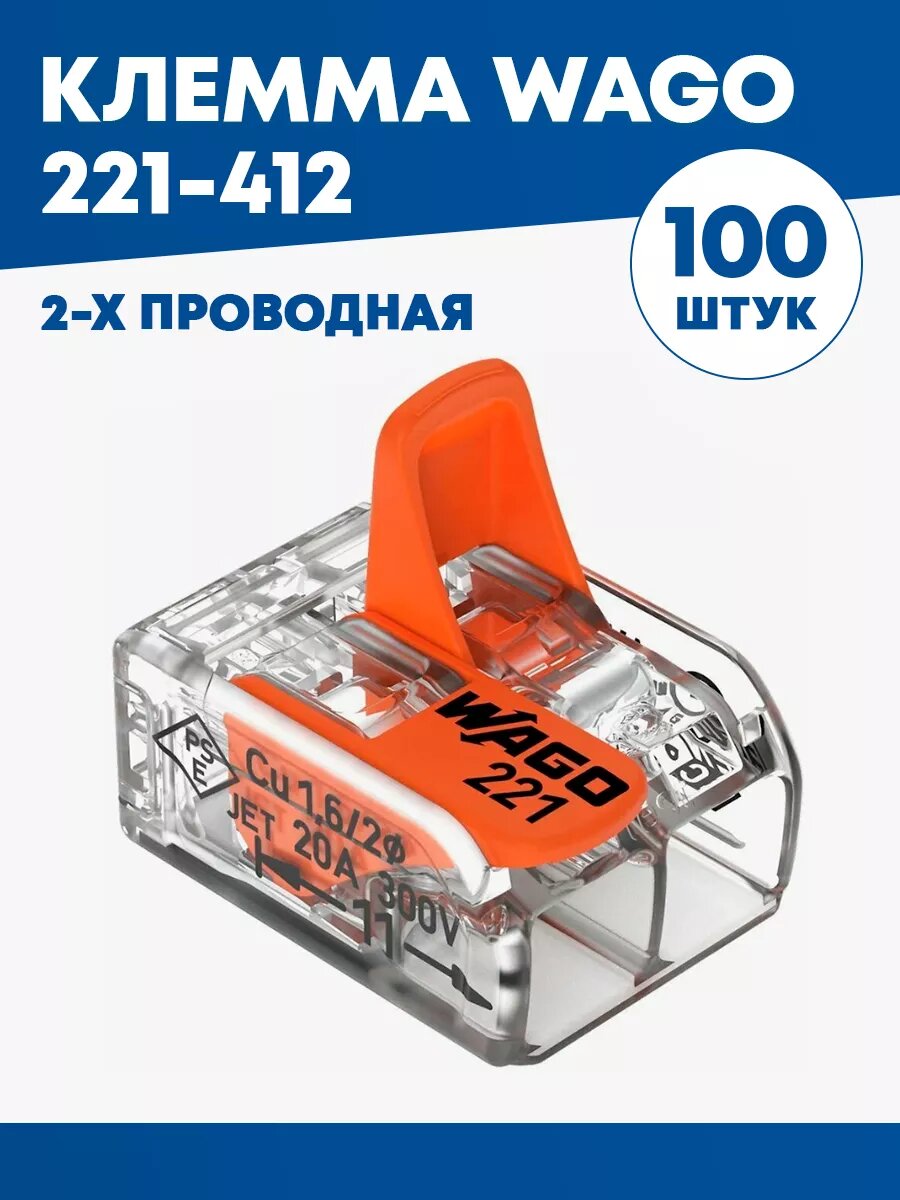 Клеммы WAGO 2-х проводные,Оригинал (221-412) прозрачные/оранжевые 1 упаковка(100 клемм)