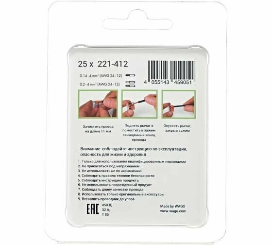 WAGO Клеммы 221-412 в блистерной упаковке (25шт.)