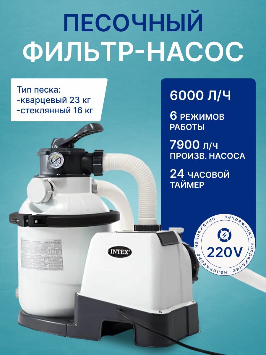 Песочный фильтр-насос для бассейна Intex 26646, производительность - 6000 л/ч (фильтрация), 7900 л/ч (циркуляция) интересное: