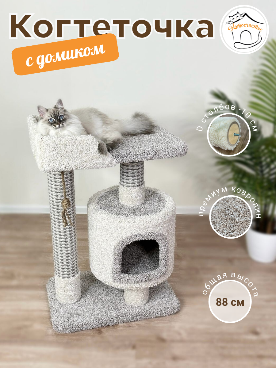 Когтеточка "Котосчастье"с домиком и лежанкой из ковролина, серая с белым