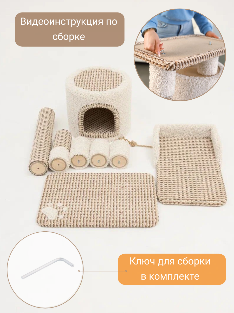 Купить Когтеточка " Котосчастье" с домиком и лежанкой из ковролина, высота 88 см, цвет - бежевый