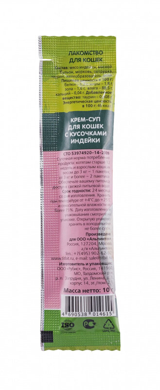 | Состав | мясо индейки, мясной, бульон, морковь, петрушка, таурин, желеобразователь, вода |