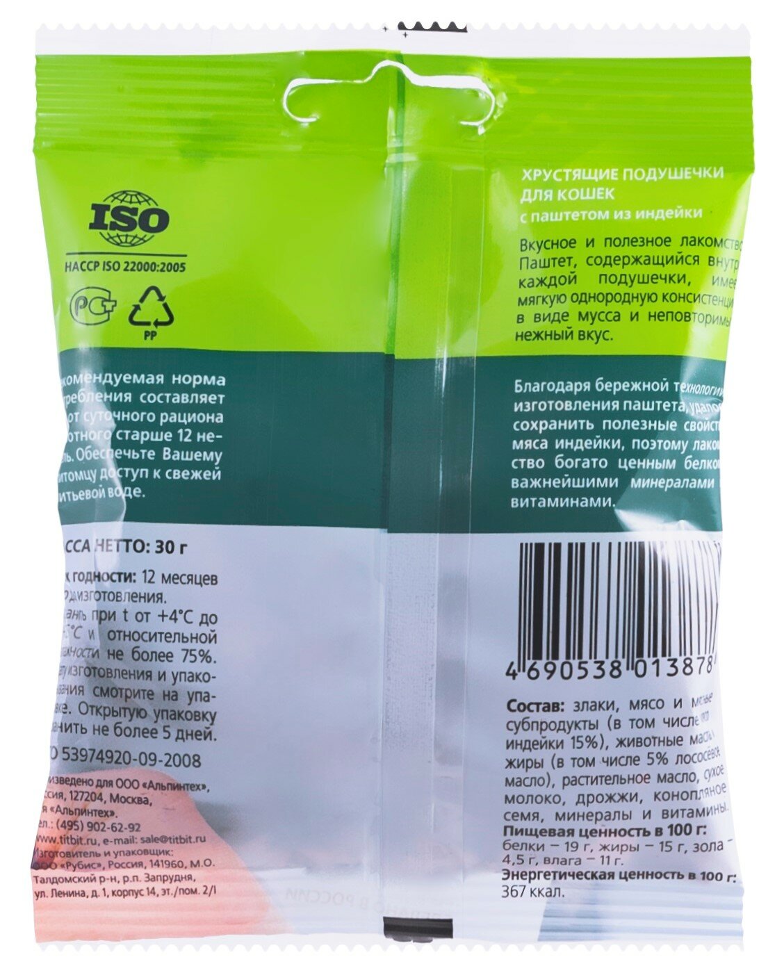 TiTBiT 30г хрустящие подушечки для кошек с паштетом из индейки