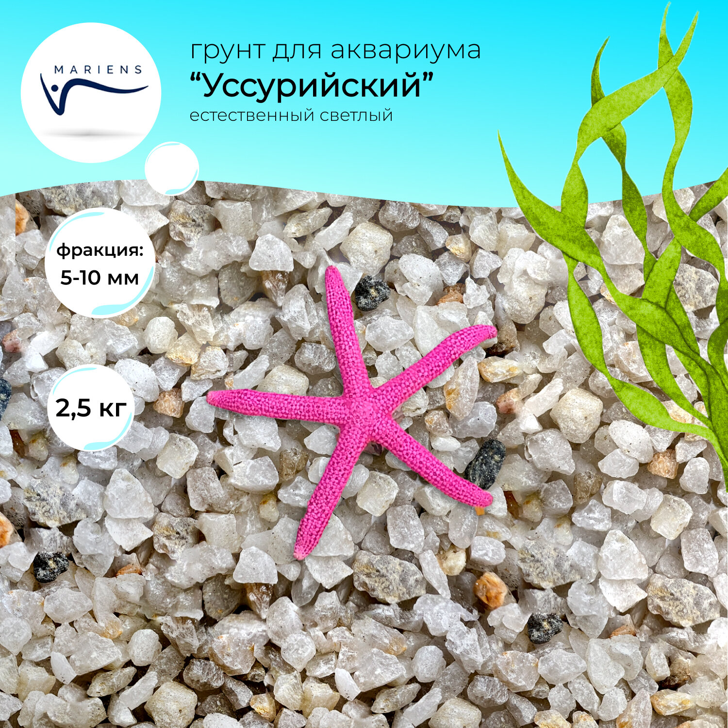 Натуральный грунт MARIENS "Уссурийский", естественный светлый, 2,5 кг, размер фракции: 5-10 мм - для аквариума, природный