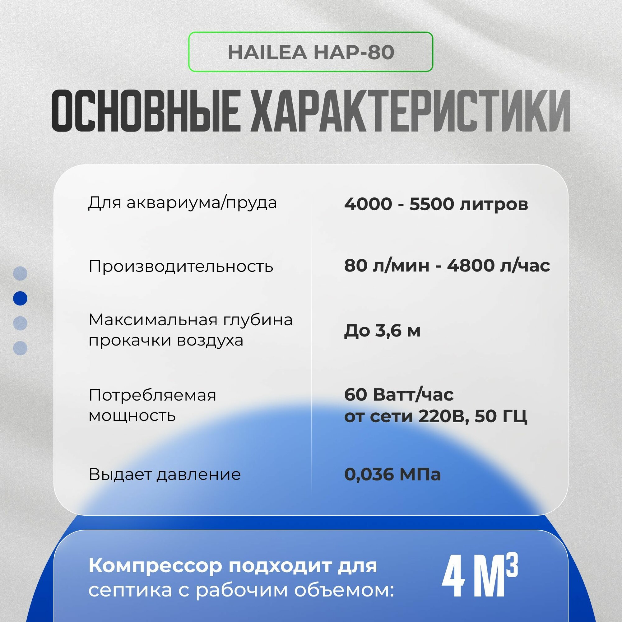 | Дополнительная информация | частота 50 Гц; мощность 45 Вт;; максимальная глубина прокачки воздуха 3,5 м; производительность 60 л/мин |