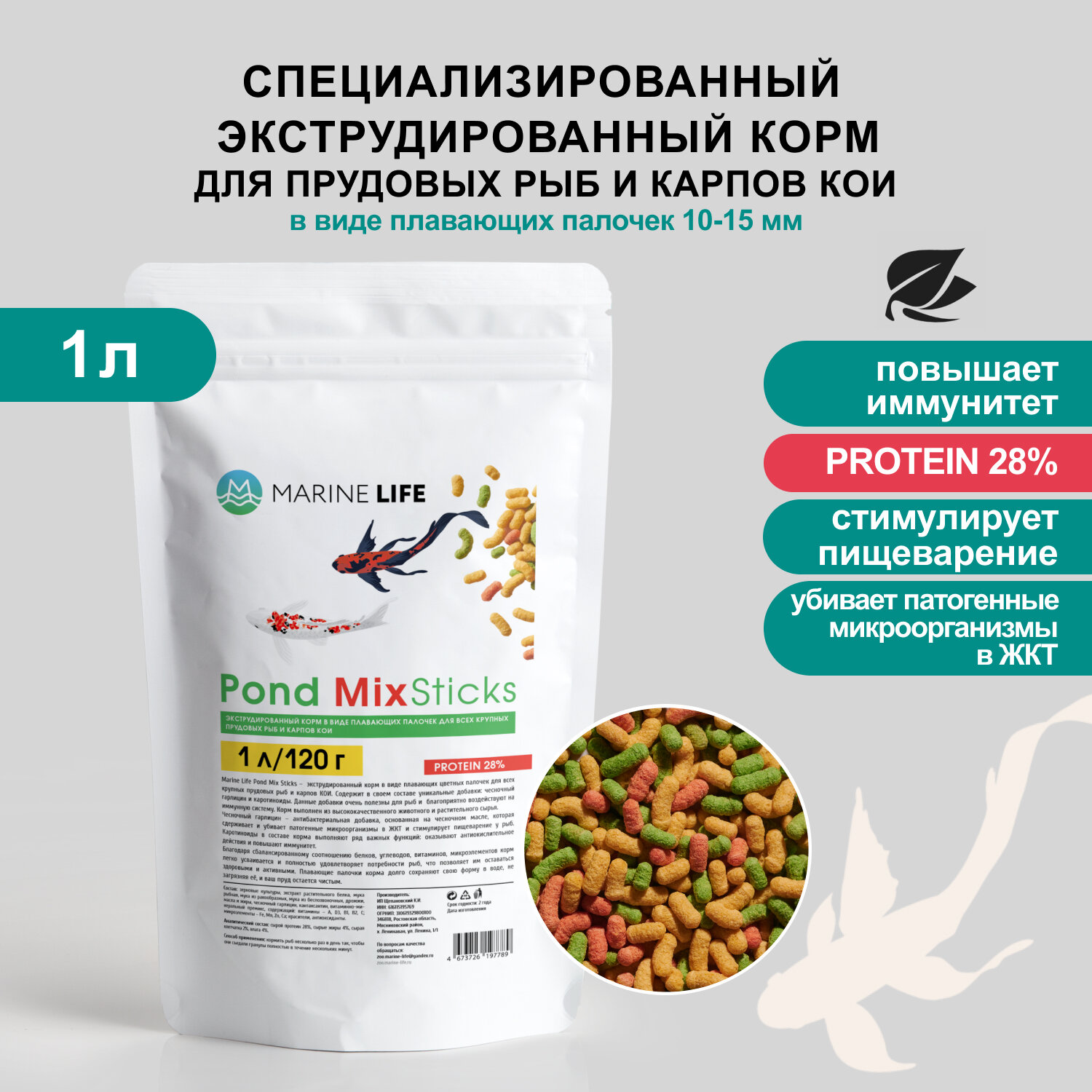 Корм Marine Life Pond MIX, для прудовых рыб, карпов, КОИ, плавающие палочки, 1,2 кг