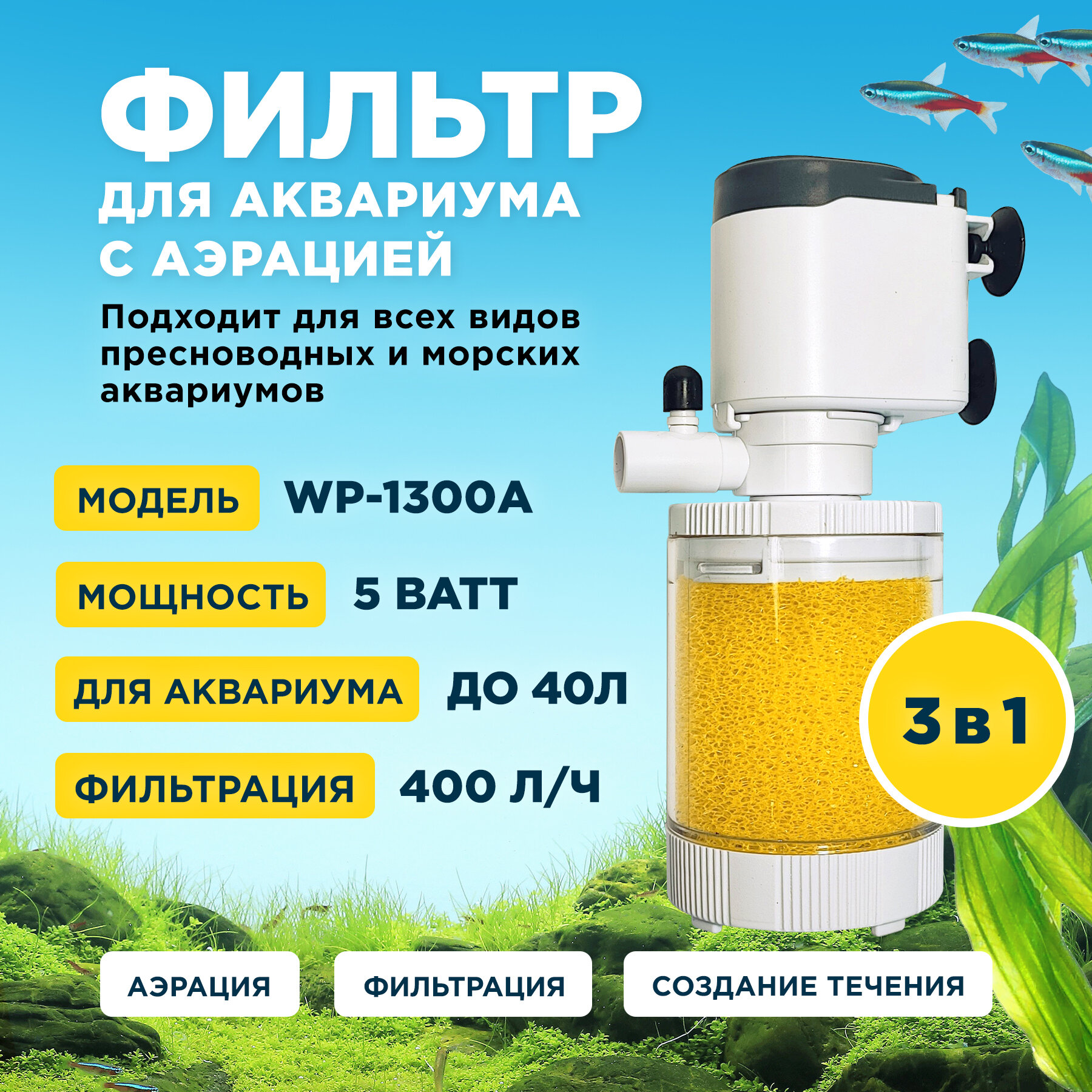 Фильтр внутренний SOBO WP-1300A, мощность 5w/ватт, для аквариума до 40л (400 л/час) многофункциональный с аэрацией, камерный