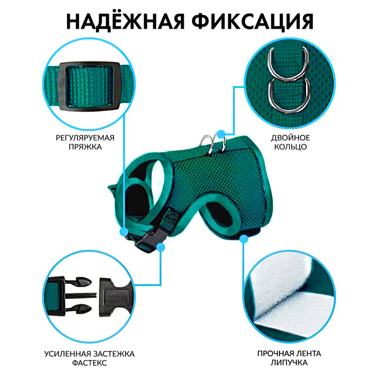 Шлейка для кошек с поводком 1.5 м для прогулки / Шлейка для кроликов и собак мелких пород / изумрудная M