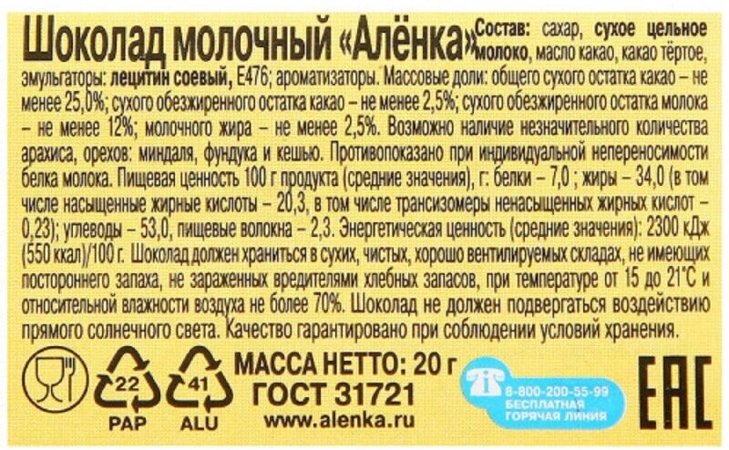 Шоколад Алёнка Молочный 15г 42шт